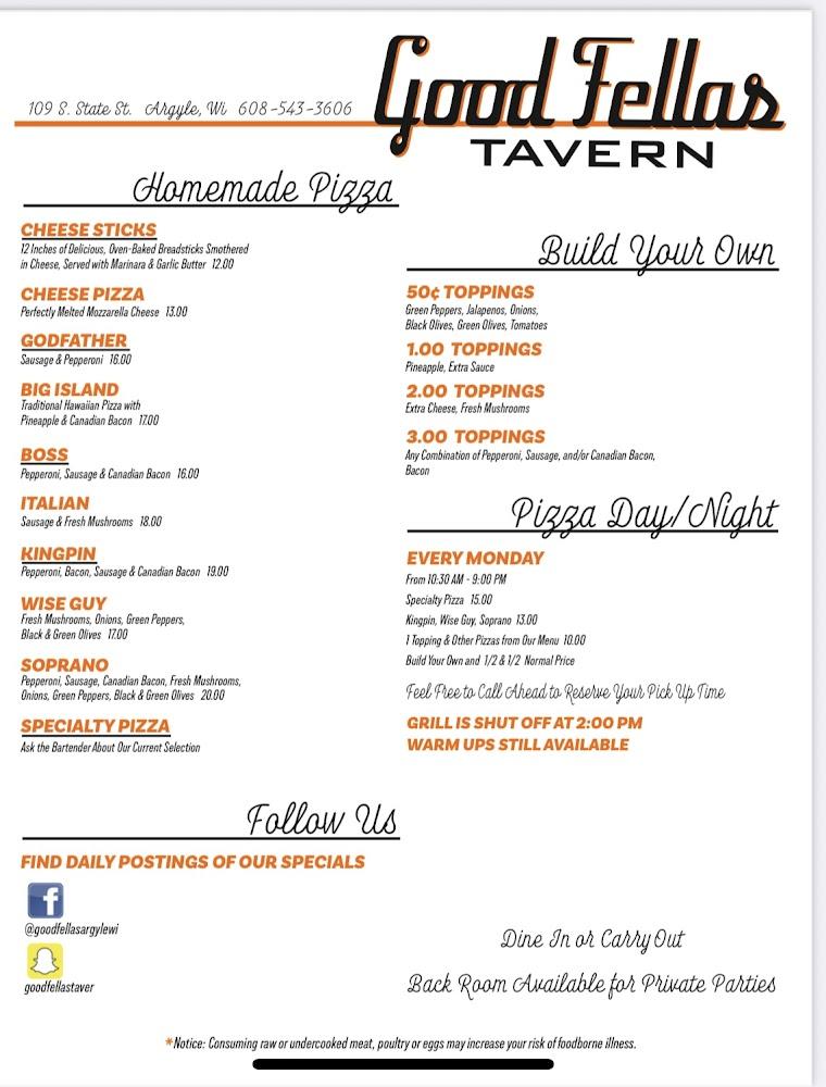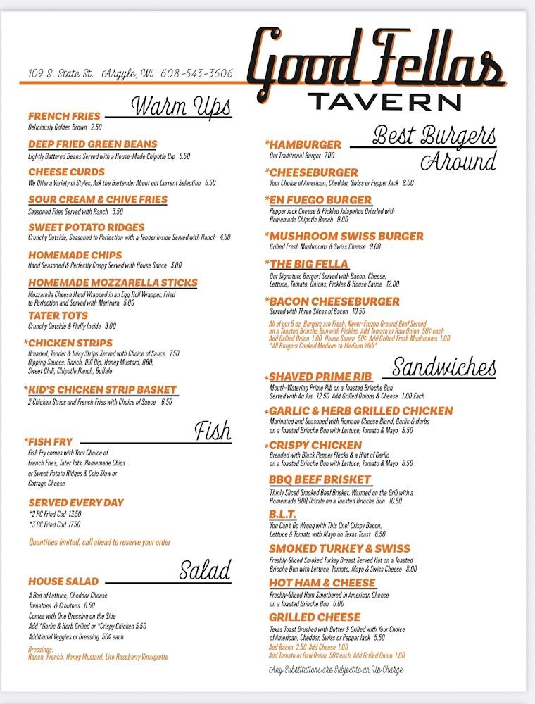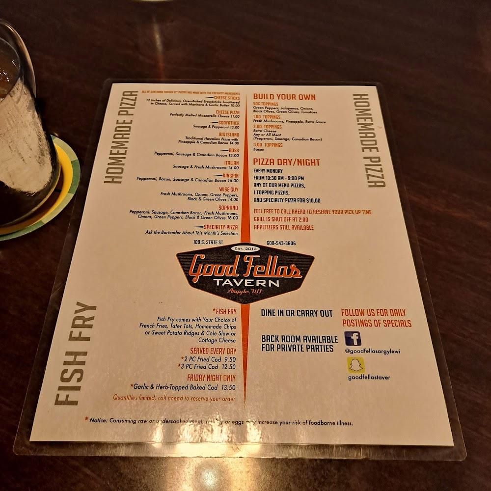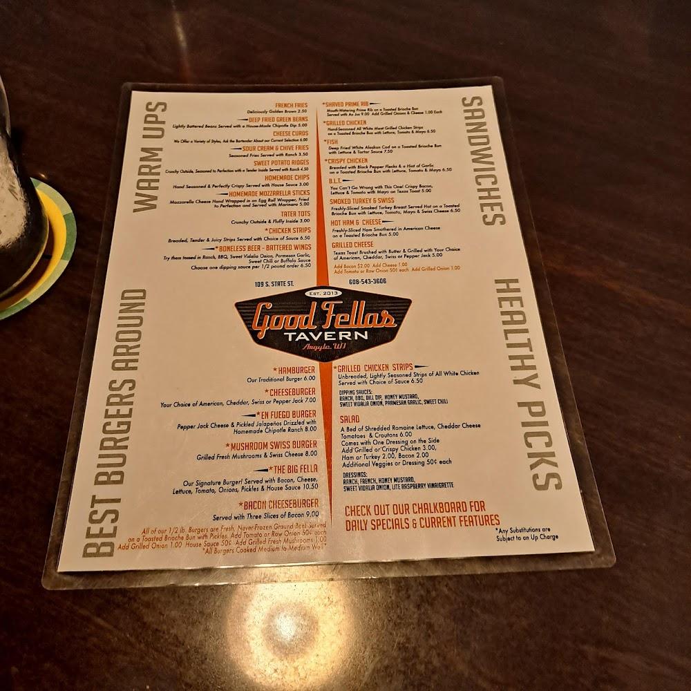 Welcome to Good Fellas Tavern, your go-to destination in Argyle for a classic tavern experience! Located at 109 S State St, we pride ourselves on serving excellent cocktails and restaurant-quality food in a relaxed and inviting atmosphere. Enjoy a diverse menu featuring local specialties, paired with a wide selection of beers and spirits. Whether you're here for lunch, dinner, or a late-night snack, our quick service and lively ambiance set the perfect backdrop for gatherings, sports events, or solo dining. With options for takeout and delivery, we cater to all. Join us for unforgettable evenings filled with music, fun, and great company!